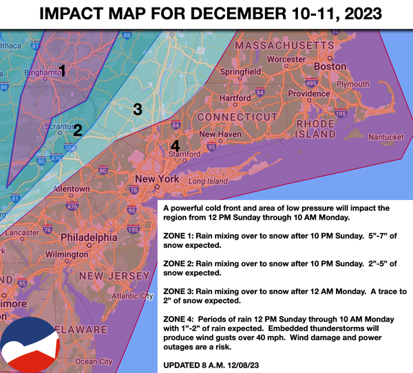 A powerful cold front will exit in the morning hours with periods of rain and embedded thunderstorms with very windy conditions. The rain may mix with snow before ending in the Poconos and Catskills with some accumulation. Will will veer from the south to the northwest at 10 to 20 mph with gusts between 25 to 50 mph. Power outages and wind damage will be