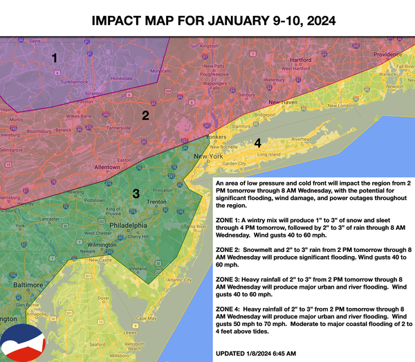 Clouds will increase in the morning. A wintry mix of snow, sleet, and rain will mix over to rain in the Poconos and Catskills, while rain will develop elsewhere in the afternoon. Winds will be from the east at 10 to 20 mph, with gusts increasing to over 40 mph by the evening. Temperatures