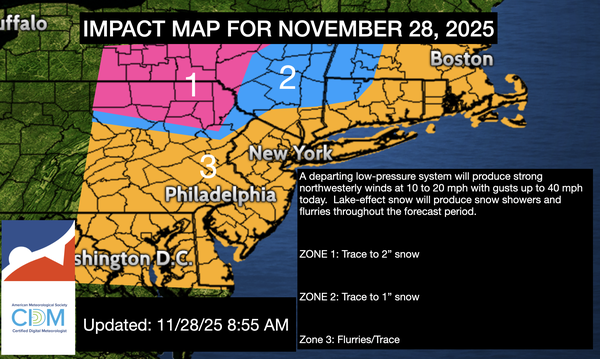 A cold front will produce scattered clouds and flurries throughout the region. Snow showers will produce minor snow accumulation for the Poconos and Catskills. Winds will be from the west at 10 to 20 mph with gusts up to 40 mph. High temperatures will range from the lower to mid-30s over the interior and upper 30s to lower 40s along the