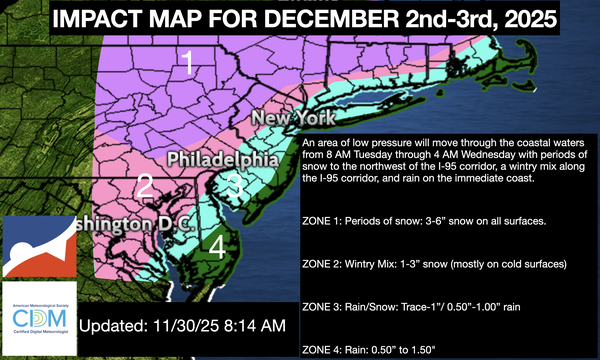 waters, with snow showers developing throughout the region. The snow will mix over to rain southeast of the I-95 corridor and a wintry mix along the I-95 corridor. Snow will continue to the northwest of the I-95 corridor with snow accumulation. Winds will be from the northeast at 1 to 5 mph. High temperatures will range from the lower to mid-30s over the interior, mid to upper 30s in the Delaware River Valley, and upper 30s to the lower 40s along the