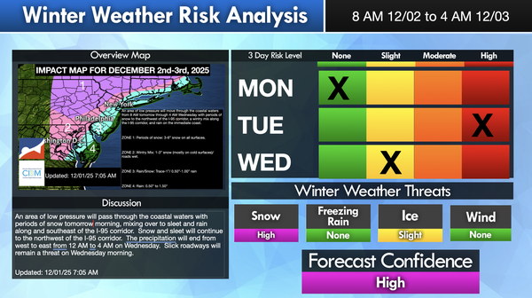 A winter storm will approach tomorrow with accumulating snowfall over the interior and a wet wintry mix on the I-95 corridor. Cold conditions take hold into next week with some wintry precipitation a threat.