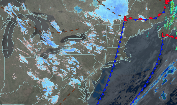 An area of low pressure will produce periods of light to moderate snow, especially along and southeast along the I-95