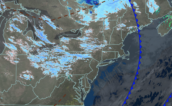 An area of low pressure will produce periods of light to moderate snow, especially along and southeast along the I-95