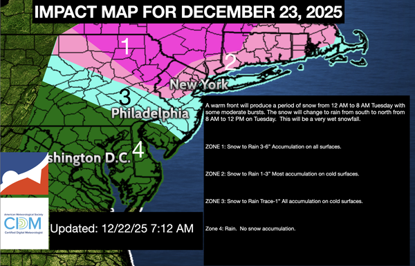pressure will produce periods of snow over the interior, a wintry mix in the New York City metropolitan area, and snow to rain in the Philadelphia metropolitan area. Low temperatures will range from the mid to upper 20s over the interior and lower to mid-30s along the coast. High temperatures will range from the lower to mid-30s over the interior, mid to upper 30s in the New York City metropolitan area, and lower to mid-40s in the Philadelphia metropolitan