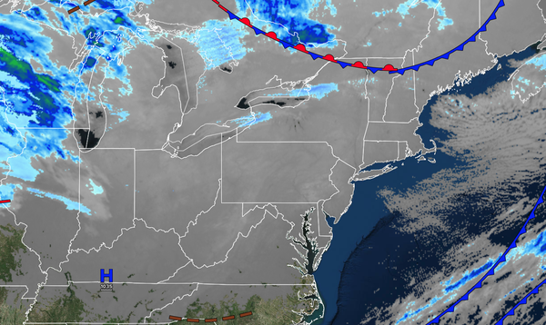 A trough will produce scattered clouds and flurries. Winds will be from the south at 5 to 15 mph. High