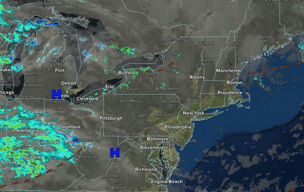 An area of low pressure will produce periods of rain. Snow and sleet will mix with rain at higher elevations in the Poconos and Catskills. Low temperatures will range from the lower to mid-40s. High temperatures will range from the mid to upper
